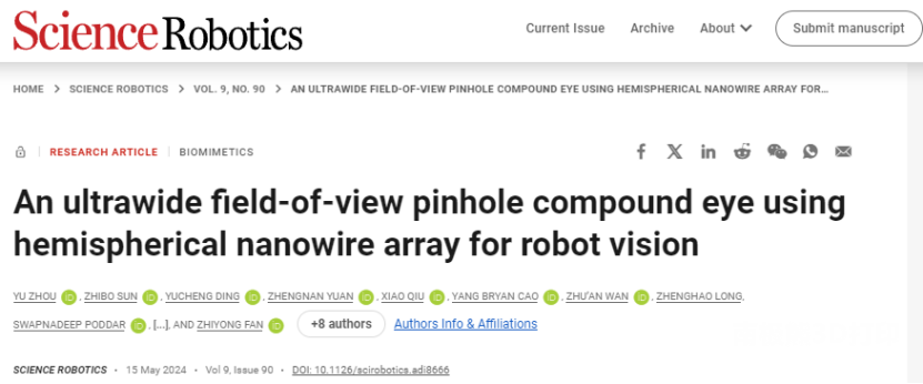 相關(guān)工作以“An ultrawide field-of-view pinhole compound eye using hemispherical nanowire array for robot vision”為題發(fā)表于國際頂級學術(shù)期刊《Science Robotics》,并當選當月封面文章。香港科技大學電子與計算機工程系博士后周宇、孫梽博和博士研究生丁宇宬為文章共同第一作者,香港科技大學電子與計算機工程系講席教授范智勇為文章通訊作者。該工作得到了香港研究資助局項目、粵港澳聯(lián)合實驗室項目、科學探索獎以及中銀香港科技創(chuàng)新獎的大力支持。