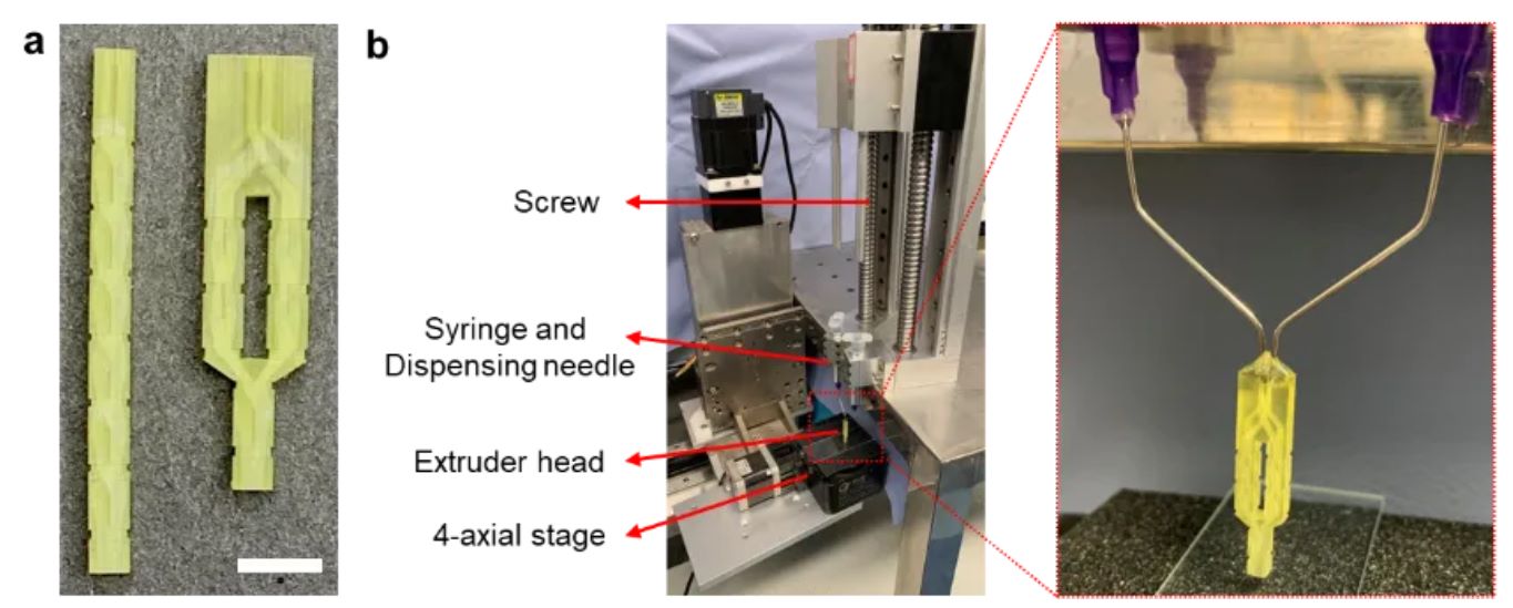 (a):串聯(lián)(左)和串并聯(lián)擠出頭(右)的照片。(b):定制的四軸打印平臺(左)和在3D打印設(shè)備中組裝的擠出頭(右)。比例尺,5 mm (a)。