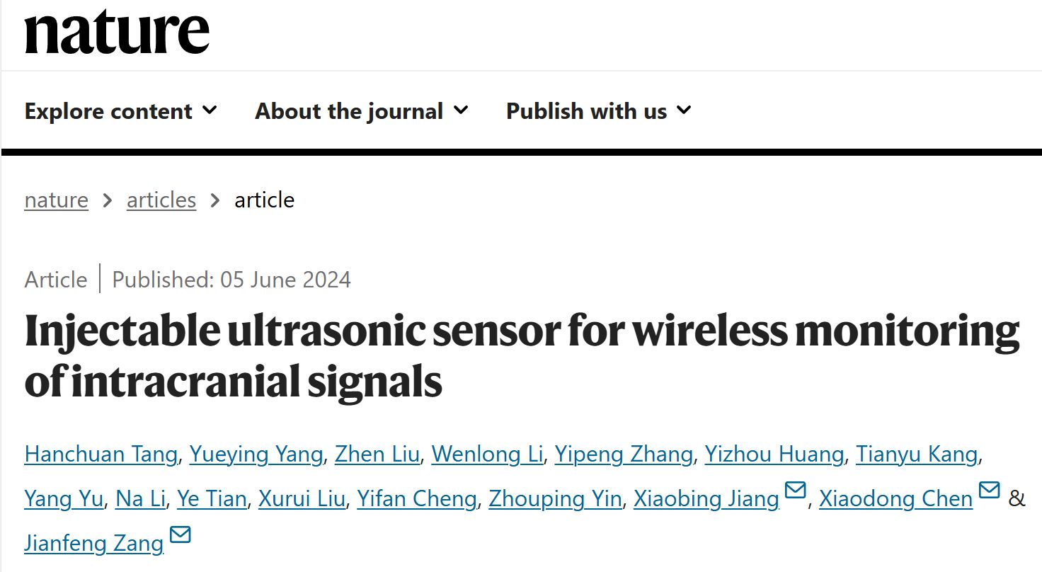 2024年6月,華中科技大學臧劍鋒教授、姜曉兵教授以及新加坡南洋理工大學陳曉東教授團隊攜手合作,研發(fā)出一種創(chuàng)新型可注射超聲凝膠傳感器,有望克服傳統(tǒng)有線傳感器存在的感染風險和術(shù)后并發(fā)癥等問題,同時避免現(xiàn)有無線電子傳感器體積過大、無法體內(nèi)降解等臨床應(yīng)用挑戰(zhàn)。相關(guān)研究成果以"Injectable ultrasonic sensor for wireless monitoring of intracranial signals"為題在線發(fā)表于《Nature》雜志。