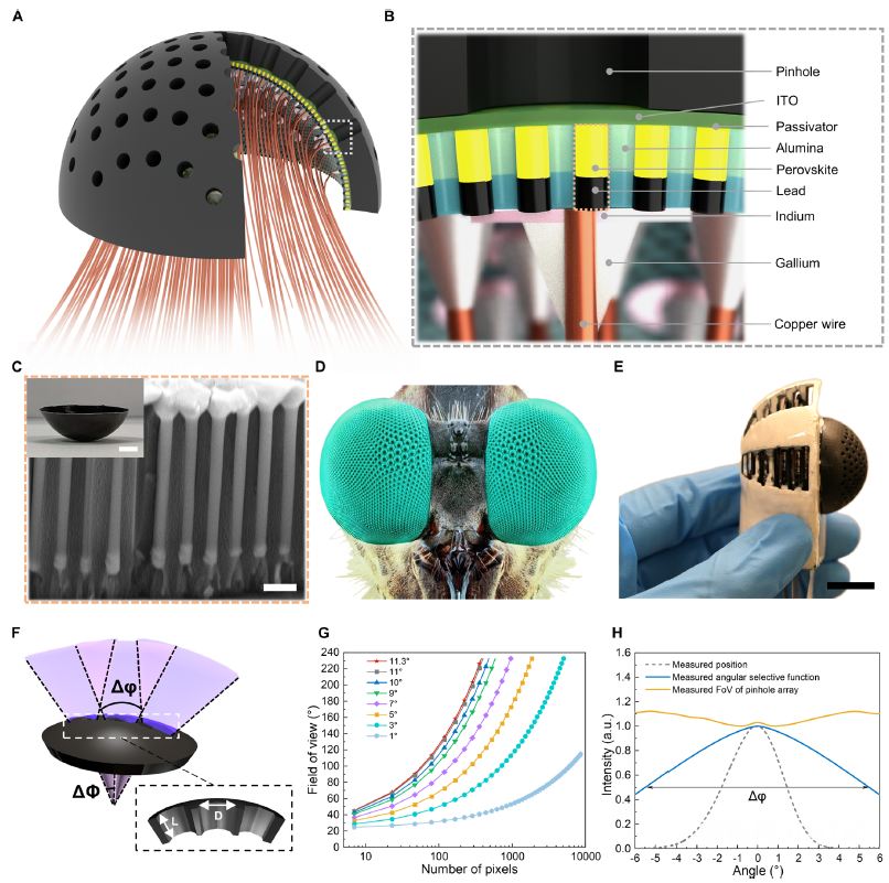 圖1. PHCE及其集成組件的示意圖和圖像。(A)PHCE整體結(jié)構(gòu)示意圖。(B)PHCE系統(tǒng)的剖視圖。(C)半球形多孔氧化鋁膜中鈣鈦礦納米線的橫截面電鏡圖像和宏觀照片。(D)強盜蠅眼的宏觀照片。(E)安裝在印刷電路板上的PHCE系統(tǒng)的側(cè)視照片。(F)相鄰針孔單元的橫截面示意圖。(G) 不同小眼間角下針孔像素數(shù)量與整體視場角的相對關(guān)系。(H)單個針孔和針孔陣列角度依賴的歸一化強度分布。