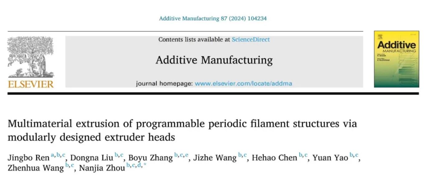 2024年6月,來自西湖大學工學院周南嘉團隊提出了一種模塊化策略設(shè)計擠出頭,利用多材料直寫工藝擠出具有可調(diào)控周期性結(jié)構(gòu)的纖維,并用來制造具有空間可編程周期性結(jié)構(gòu)的 3D 物體。研究成果以“Multimaterial extrusion of programmable periodic filament structures via modularly designed extruder heads”為題發(fā)表在學術(shù)期刊《Additive Manufacturing》上。