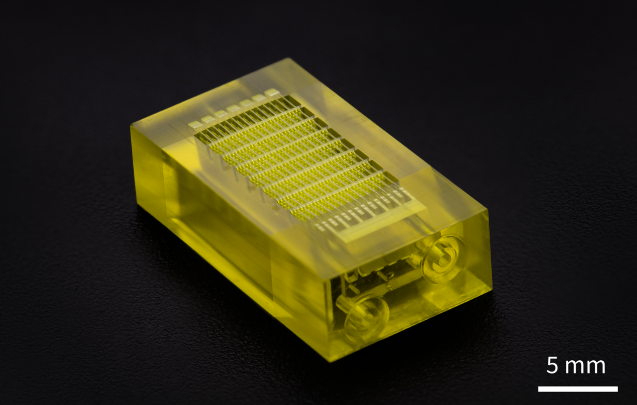 毛細血管器官芯片是利用微納3D打印技術與器官芯片的創(chuàng)新研發(fā)成果,這是一款可實現(xiàn)更高細胞培養(yǎng)密度、連續(xù)數(shù)周的長期培養(yǎng)時間、更接近人體器官功能性的各種類器官的體外3D培養(yǎng)芯片。利用毛細血管器官芯片灌輸培養(yǎng)系統(tǒng),進行營養(yǎng)物質及代謝廢物等物質交換過程,可幫助科研人員在兩周內培育出細胞模型,并完成藥物測試分析,從而有效提升藥物篩選及新藥開發(fā)進程。這款器官芯片已被用于器官組織培養(yǎng)及初期藥物測試階段,成功培養(yǎng)了結直腸癌類器官和腎近端小管類器官。